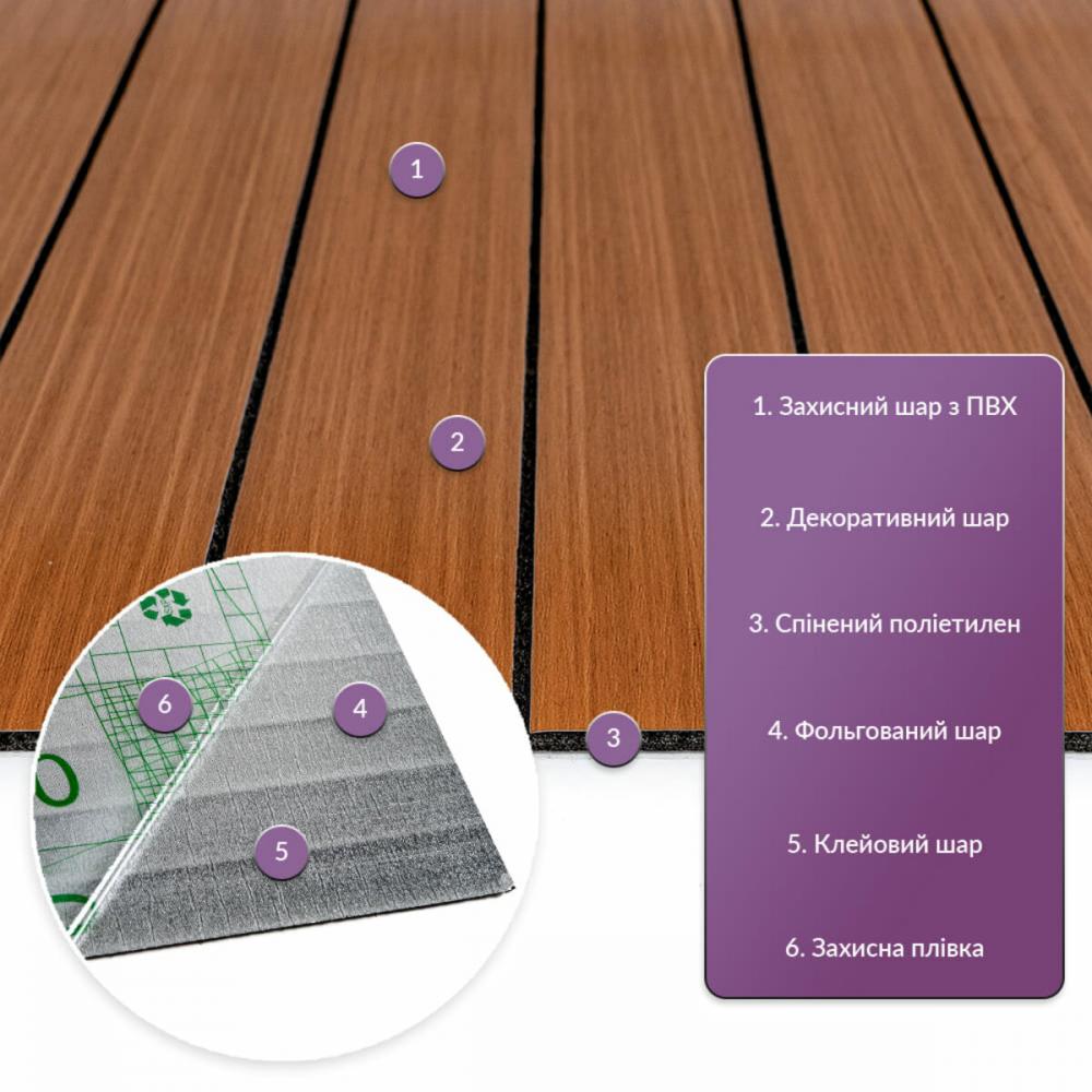 • Декоративный слой: пленка с цветной печатью высокого разрешения, которая полностью имитирует фактуру природных материалов благодаря четкому и детализированному изображению.