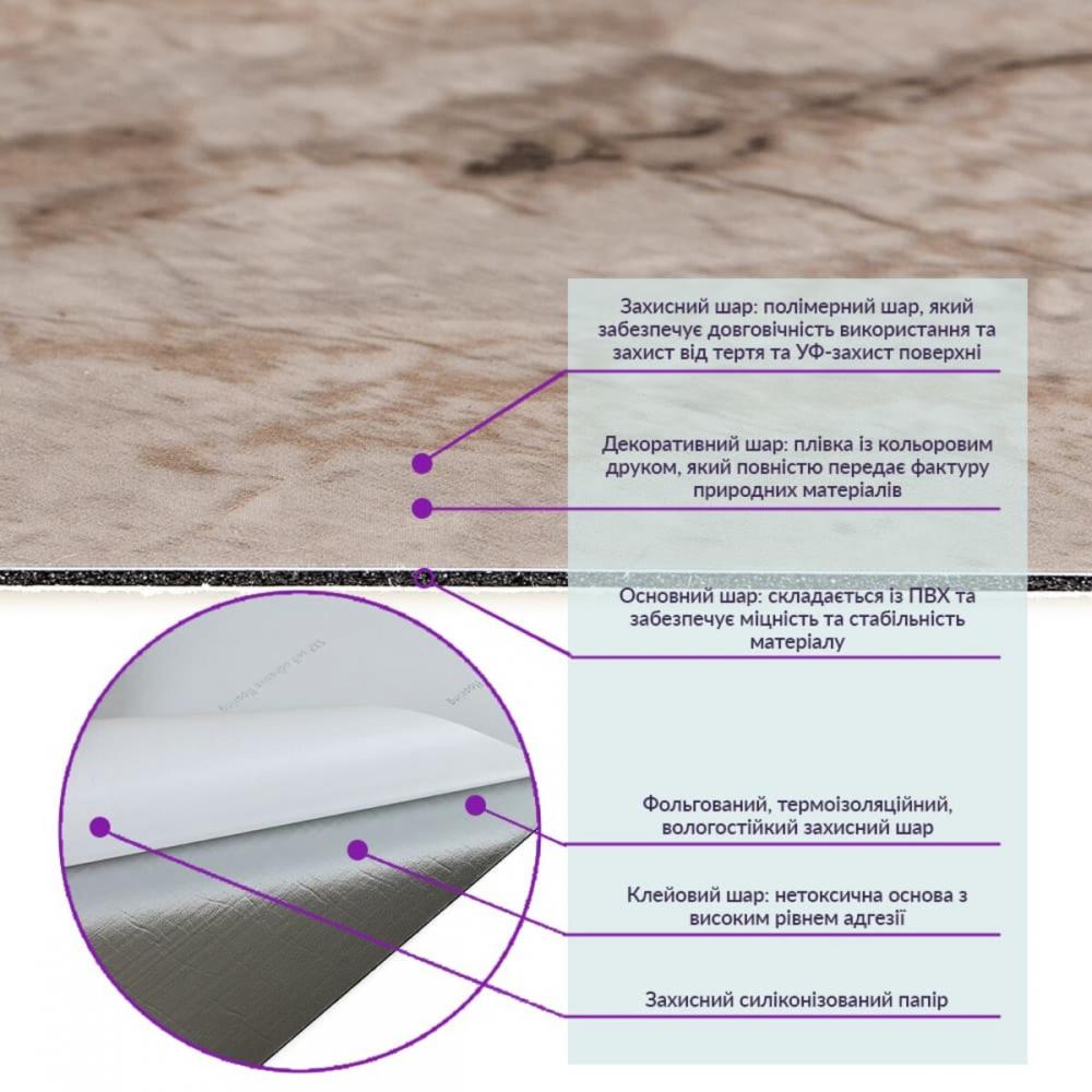- Полімерний шар: захищає від потертостей та дрібних механічних пошкоджень, забезпечує довговічність використання, а УФ захист допомагає запобігти вигоранню, зберігаючи колір насиченим.