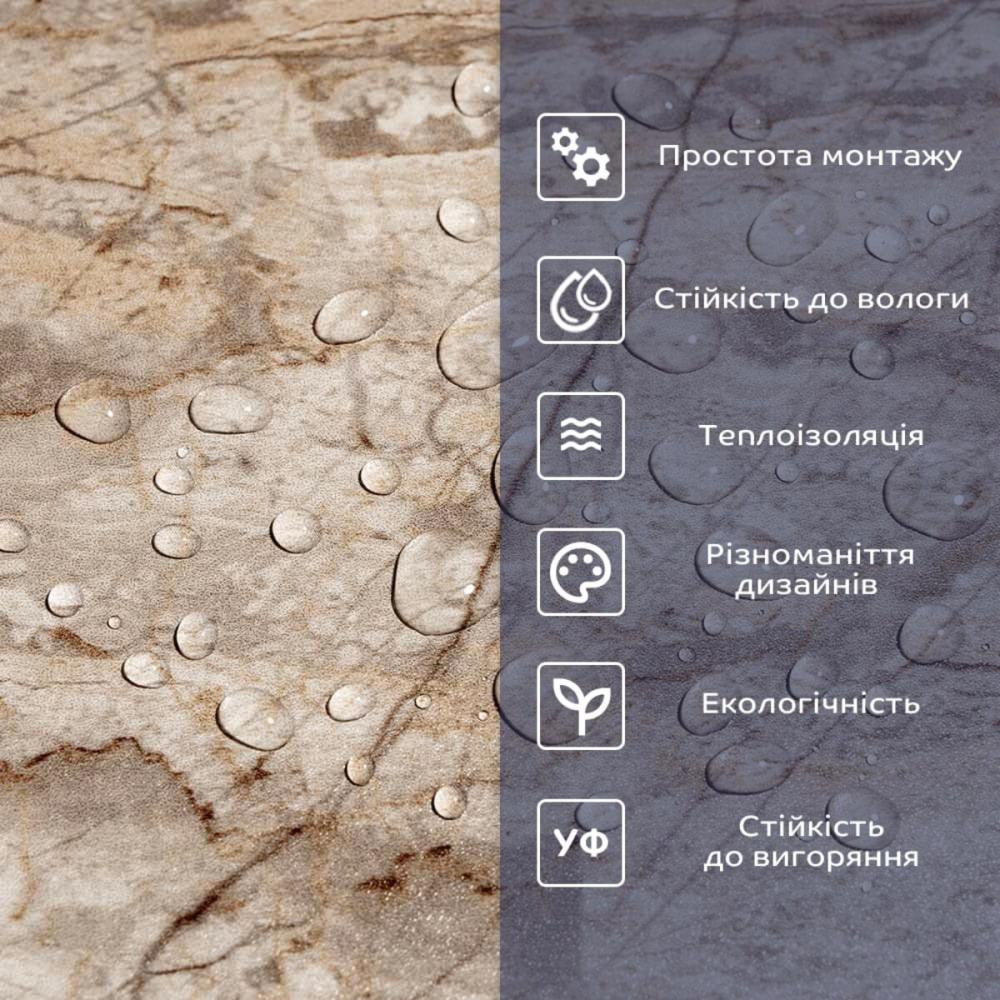 - Декоративний шар: плівка з кольоровим друком високої якості, яка повністю імітує фактуру природних матеріалів завдяки чіткому та деталізованому зображенню.